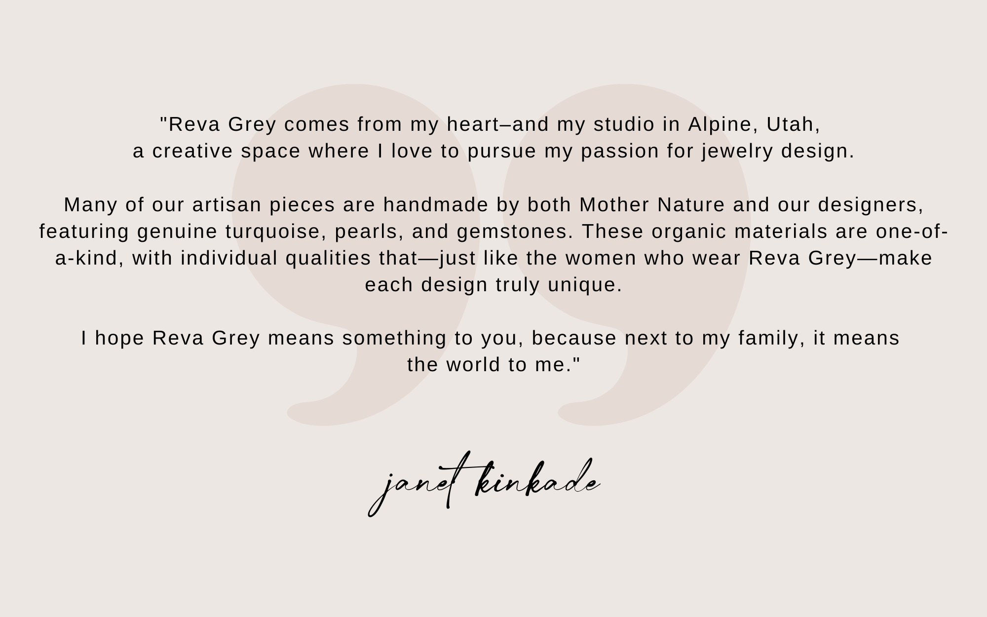 A few years later, Janet returned to her roots in design and launched Reva Grey, an online jewelry brand, specializing in handmade gold, sterling silver, and turquoise pieces.